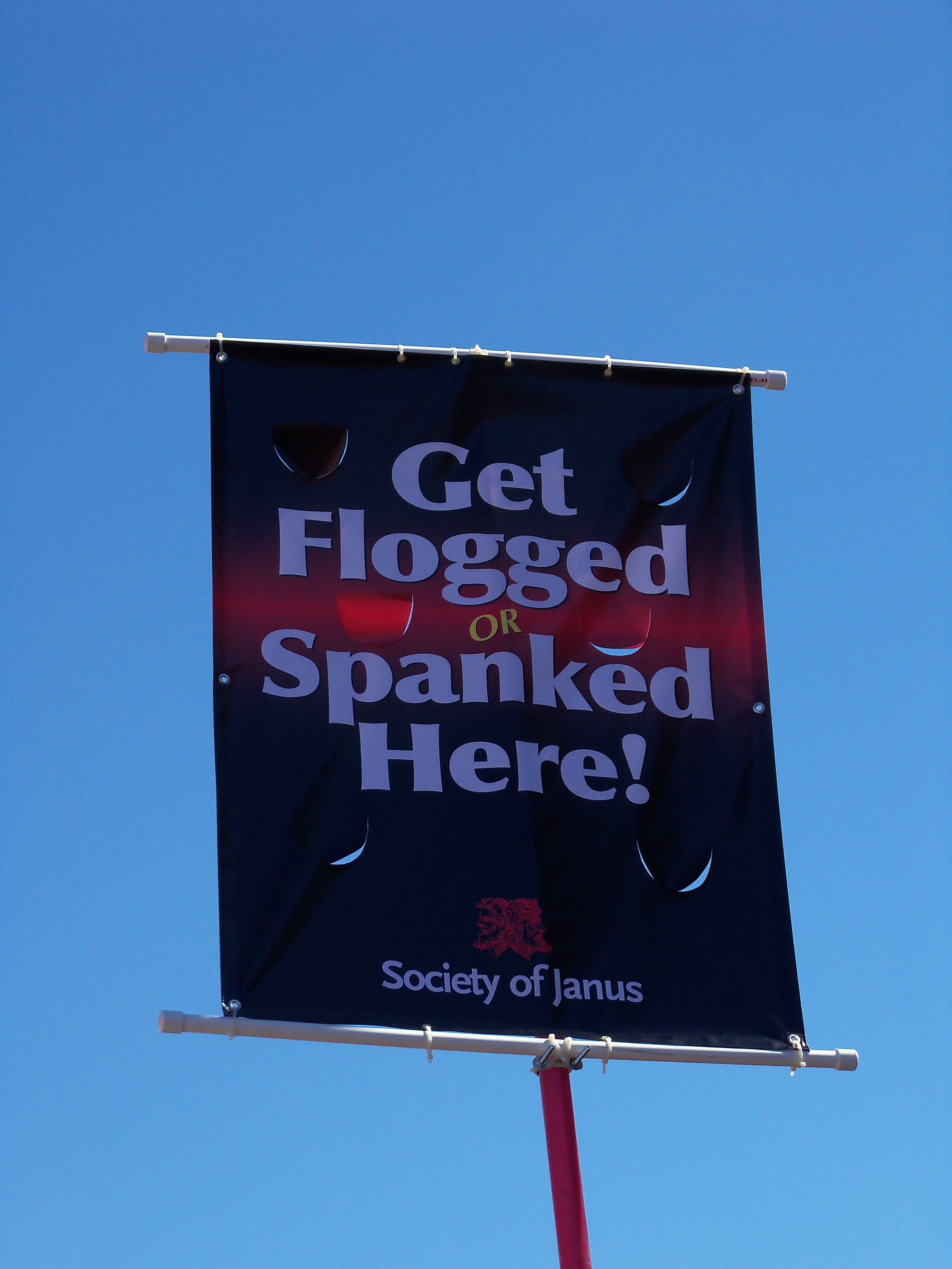 Wie bei jedem Straßenfest in San Francisco, gibts auch auf der “Folsom Street Fair” Verkaufsstände. Ich hatte mit einem Verkäufer ein längeres Gespräch über Haubretter (sehen so ähnlich aus, wie das, was meine Oma benutzt hat, um vor Urzeiten Wäsche im Zuber zu wenden). Kunststoff oder Holz? Glatt oder geriffelt? Oder gar mit kunstvollen Schnitzereien? Ist der Einsatz von Tropenhölzern politisch korrekt? Gibts das auch für Linkshänder? Habe von einem Kauf abgesehen. Will weder hauen noch gehauen werden, und für die Wäsche habe ich eine Waschmaschine.