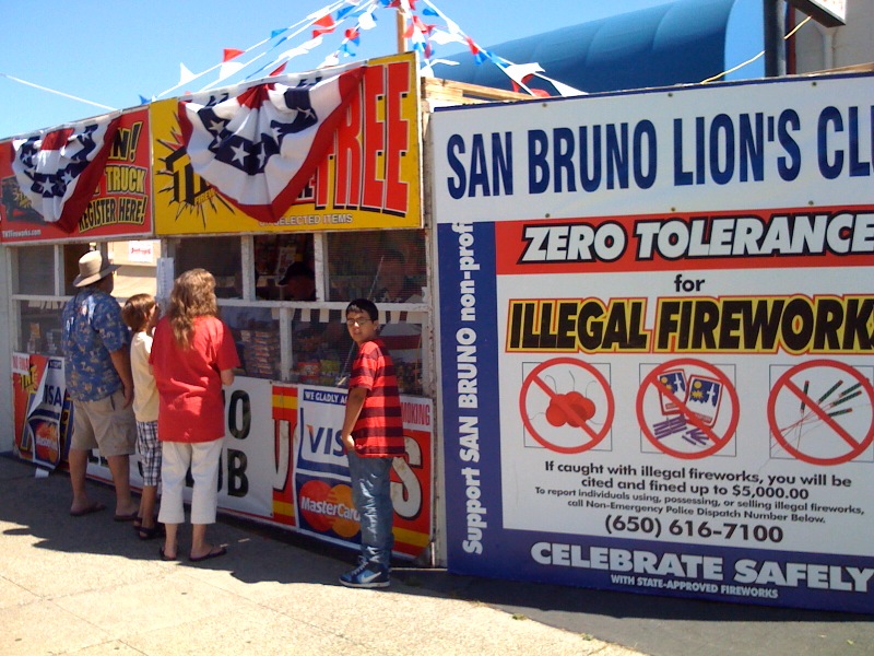 Carmen und ihre Schwestern haben in der letzten Woche alle mindestens einen Abend lang ehrenamtlich Feuerwerkskörper für die Schulen ihrer Kinder verkauft. Es ist nämlich so: Feuerwerk ist eigentlich böse. Es wird aber gut, wenn der Gewinn aus dem Verkauf einer guten Sache dient (Schule, Heilsarmee, Altersheim…). Die Verkaufsbuden dürfen jedoch wegen Brandgefahr nicht in der Nähe dieser Institutionen aufgestellt werden. Deswegen wählt man als Standort meist recht belebte Straßenkreuzungen. (Da ist es dann nicht so schlimm, wenn’s brennt? Das verstehe, wer will.) Statt der üblichen 9,25% Sales Tax werden 17% erhoben und die Differenz geht direkt an die Feuerwehr (das wiederum scheint mir einsichtig). Carmens “Booth” (eine von ca. 15 in San Brunos Stadtgebiet) hat innerhalb einer Woche $65,000.00 Umsatz gemacht. Nicht übel.
