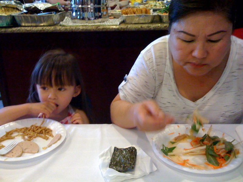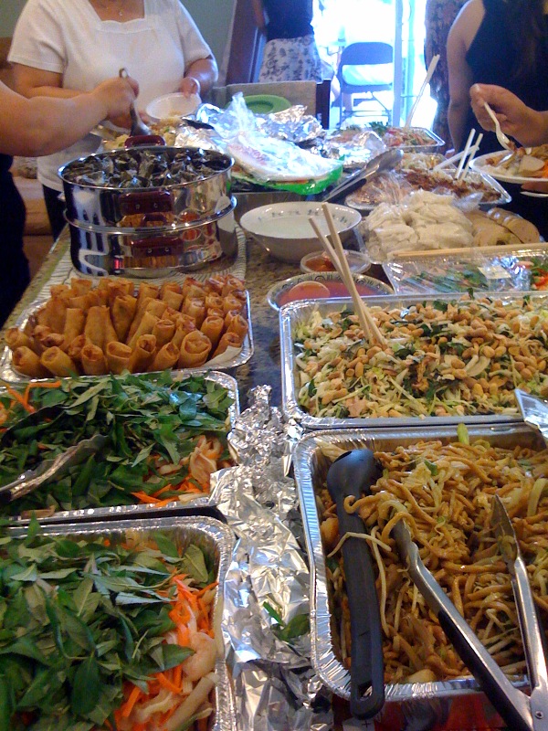 Als es ans Teller volladen ging, bekam ich von Lien und Kusine Nancy jedes Gericht erklärt und die Zutaten aufgelistet, und meistens, um die Sache abzukürzen, kurzerhand einen Happen in den Mund gesteckt. “You like?” “Mmmphpf, yeah…” – und wieder eine Schaufel voll drauf. Obwohl so viele Menschen da waren, war immer ganz zufällig die Person, die das, worauf ich gerade kaute, zubereitet hatte, in meiner Nähe, um einen Kommentar abzuholen. “You like?” “Mmmphpf, yeah…” “Want more?” “Mmmphpf, gimme a break…” Auf dem Photo sieht man nur eine kleine Auswahl der Vorspeisen und Salate, auf dem Herd simmerten mehrere Töpfe mit warmen Gerichten, und die Dessert Auswahl war ebenso reichhaltig. Allein von diesen Kuchen gab es fünf, dazu (ca. 60!) Windbeutel (“Puff Cakes”) mit Früchten und Sahne gefüllt (“My speciality, Mascarpone Cheese and Heavy Whipped Cream. No carb.” “No, just fat…” “Yeah, but healthy: no carb.” Dazu muss man wissen, dass “carbs”, also Kohlenhydrate, in USA des Teufels sind. Ob das aber eine dreizentimeterdicke Sahneschicht aus nur Fett wirklich zu gesunder Ernährung macht?), Berge von Jell-Os, traditionelle Sticky-Rice und Bohnensüßspeisen, kleine Kuchen und Petit Fours, und cookies für die Kinder. Nancy (die irgendwie zu meiner persönlichen Betreuungskusine geworden war) hat’s mir erklärt: man esse jetzt, dann mache man ein bißchen Pause, hole sich vielleicht was Süßes und dann esse man in einer Stunde wieder. So drei bis vier Runden pro Person seien üblich. Anschließend werden die Reste verteilt, entsprechende Behälter seien in einer Kiste in der Garage vorbereitet.